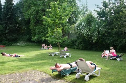 Das 25m-Schwimmbecken hat einen Nichtschwimmerteil und für die kleinen Badegäste gibt es ein Kinderplanschbecken mit konstanten 32°C zum Wohlfühlen. Bei schönem Wetter ist der Ausgang in den angrenzenden Garten geöffnet. Der Garten eignet sich sehr gut zum Relaxen in der Sonne oder im Schatten schöner Bäume sowie zum Spielen mit den Kindern.